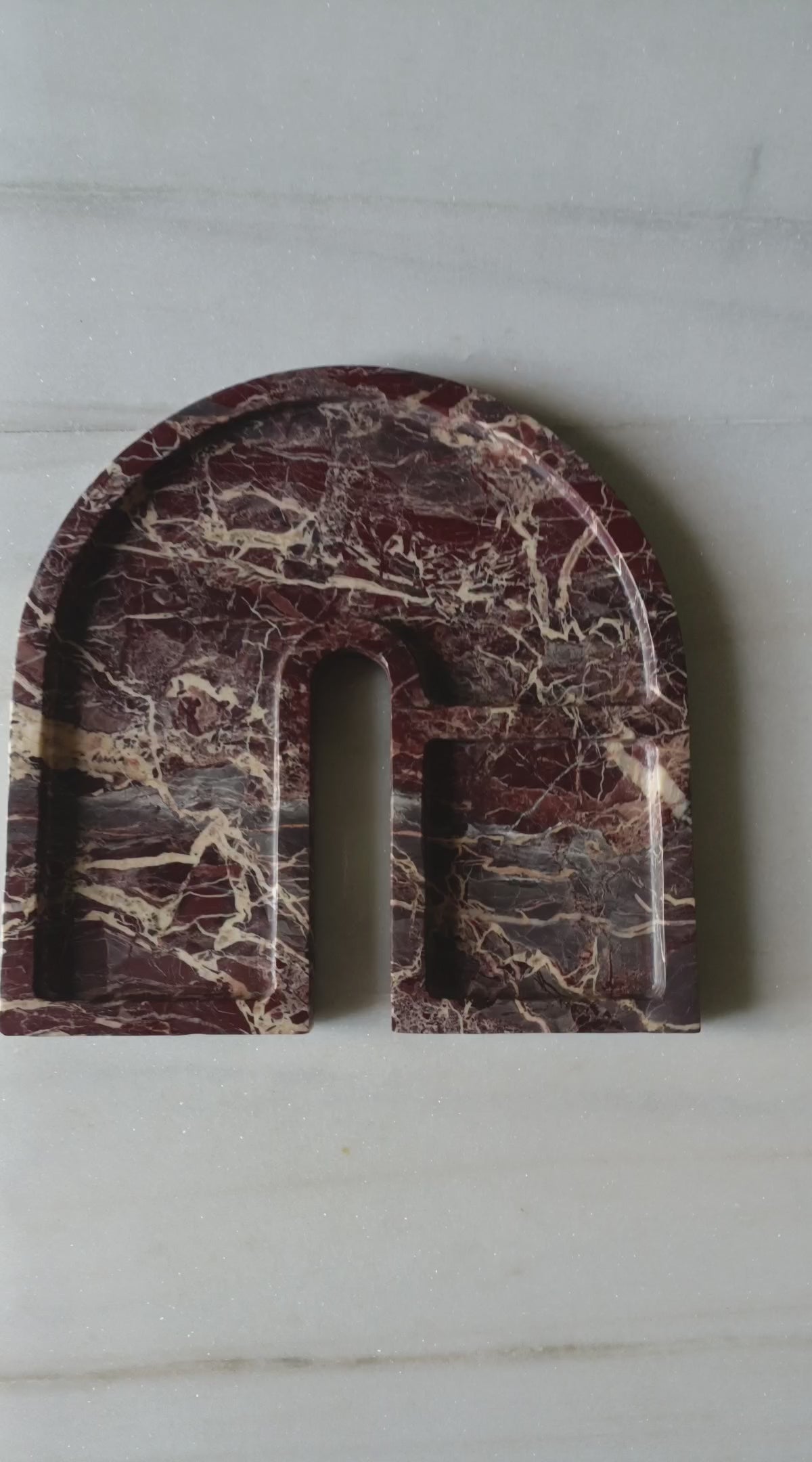 Indulge in the exquisite Éloïse Tray: a handcrafted U-shaped tray made of cherry stone marble, embodying both grace and functionality. Its impeccably flat base and delicately raised edges make it ideal for organizing your keys, jewelry, or other small trinkets. You can also elevate your hosting game by using this opulent tray as a serving dish for cookies or drinks. Whether placed on a table or displayed on a console, the versatile size of this piece adds an elegant touch to any space. Each tray is a unique work of art, showcasing the natural hues of the stone and making it a one-of-a-kind item. With meticulous attention to detail and remarkable craftsmanship, the Éloïse Tray is a luxurious addition to your home decor. Spoil yourself or surprise someone special with this exquisite tray that exudes sophistication and serves as a thoughtful gift.