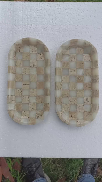 Presenting the Maël Tray, a vintage-inspired catchall that exudes quiet elegance and purposeful design. This exquisite piece features a hand-crafted checkered mosaic, merging green onyx and travertine marble in a study of natural harmony.