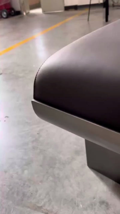 A sculptural study in softness and strength, the René Ottoman is wrapped in premium leather and elevated by its curved metal base, a visual and tactile contrast that anchors the room with quiet confidence.