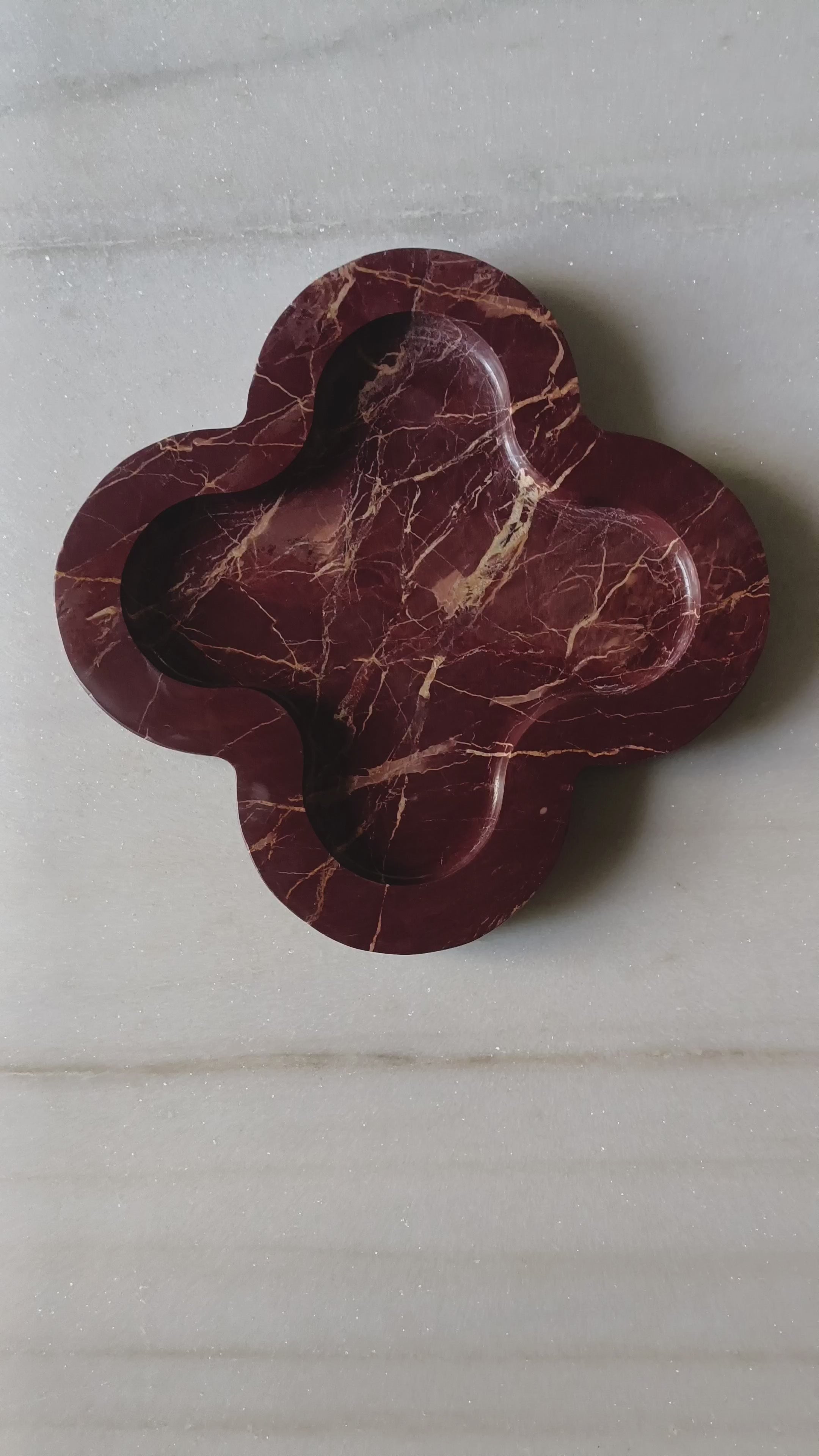 Introducing the Trèfle Tray, a refined and practical work of art that will elevate any living space. Expertly crafted from luxurious marble, this stunning clover-shaped platter showcases the beauty of nature and the allure of sophisticated design. In French culture, the four-leaf clover symbolizes luck, with each leaf representing faith, hope, love, and fortune—making this tray not only a decorative piece but also a vessel of positivity. This versatile tray adds a touch of elegance to any setting, effortlessly displaying cherished items such as keys, jewelry, or small collectibles. Its spacious surface perfectly accommodates delectable treats, from delicate pastries to refreshing beverages, making it ideal for entertaining or everyday use. The raised edges of the Trèfle Tray define its graceful silhouette while ensuring that your belongings are securely in place. Whether showcased on a stylish console table, used as a sophisticated vanity accessory, or gifted to a loved one, this marble tray exudes a timeless charm.